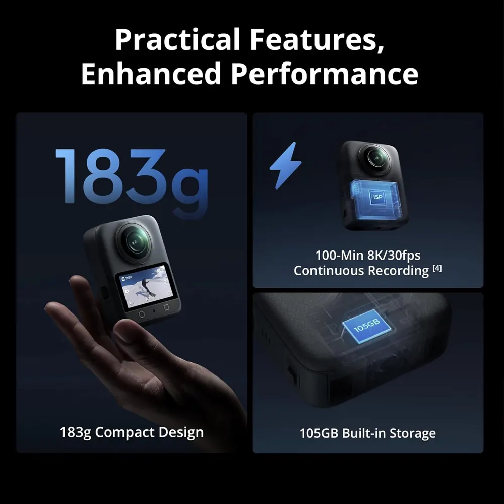 • Dual 1/1.1-inch square CMOS sensors (4000×4000, 2.4μm pixels), supports native 8K/50fps 360° video, 4K/120fps 170° Boost Video, 120MP 360° photos