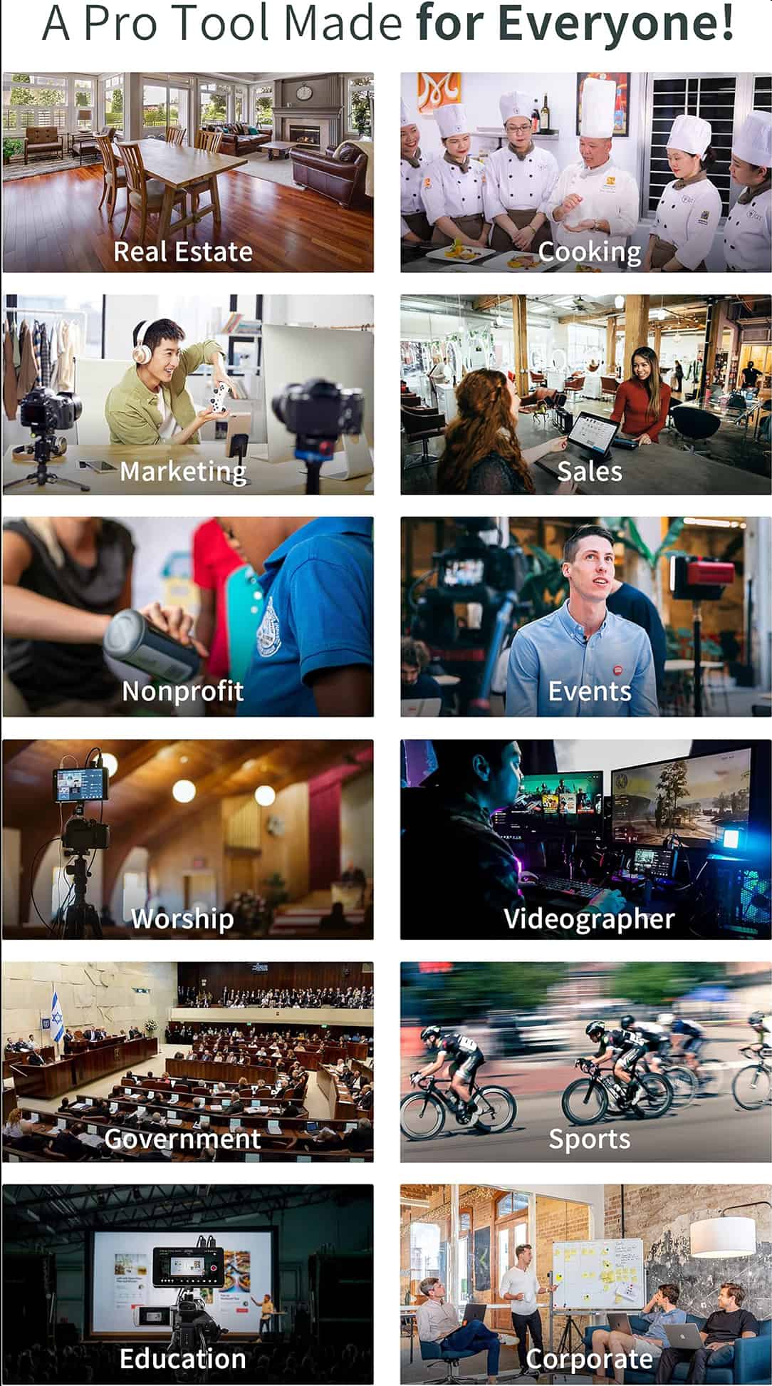 Supports multiple video sources (HDMI, USB, SD card) for flexible camera setup