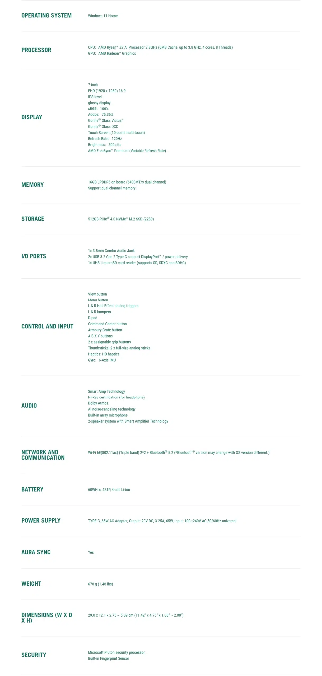 AMD Ryzen Z1 Extreme APU (4nm, Zen 4 architecture, 8 cores, 16 threads, up to 5.1GHz), RDNA 3 GPU (12 compute units)