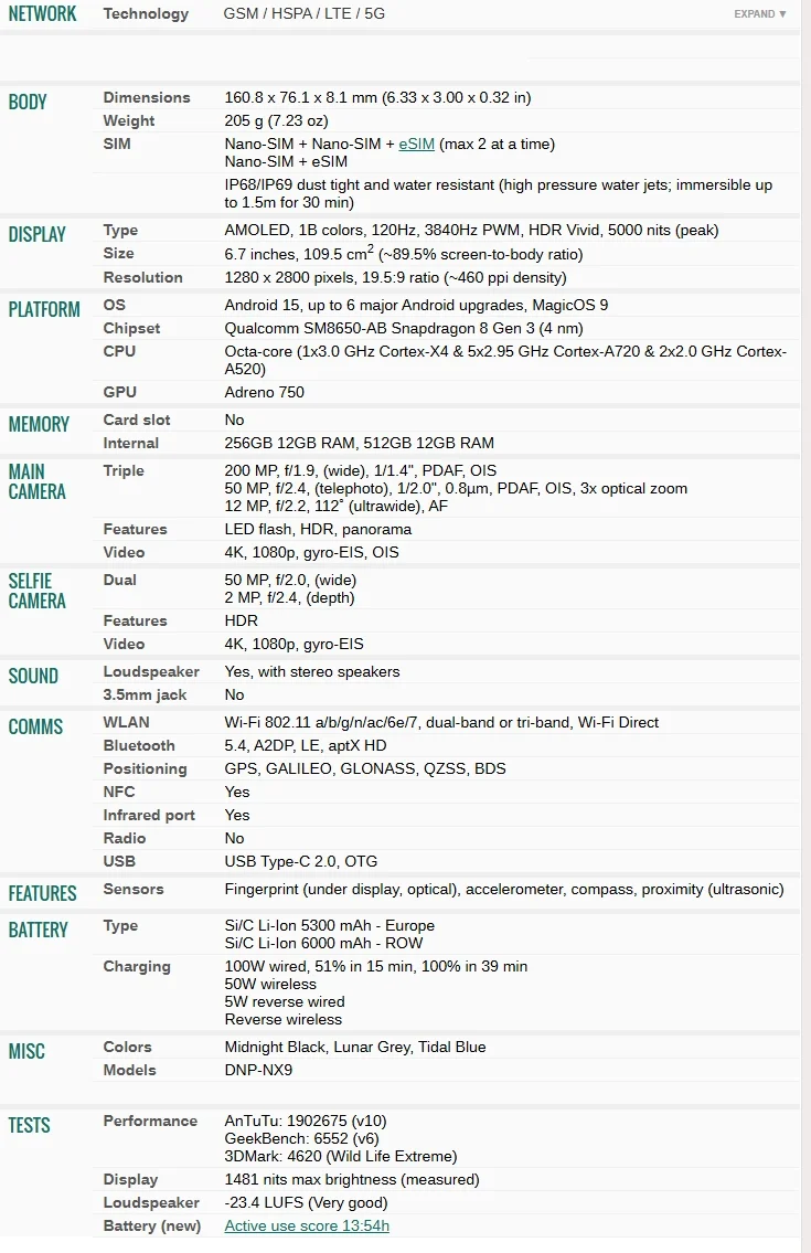 Powered by a high-capacity 5,300 mAh battery (6,000 mAh variant in some regions) with ultra-fast 100 W wired and 50 W wireless charging. Expect full charge in under 30 minutes and a day’s use on minimal charge.
