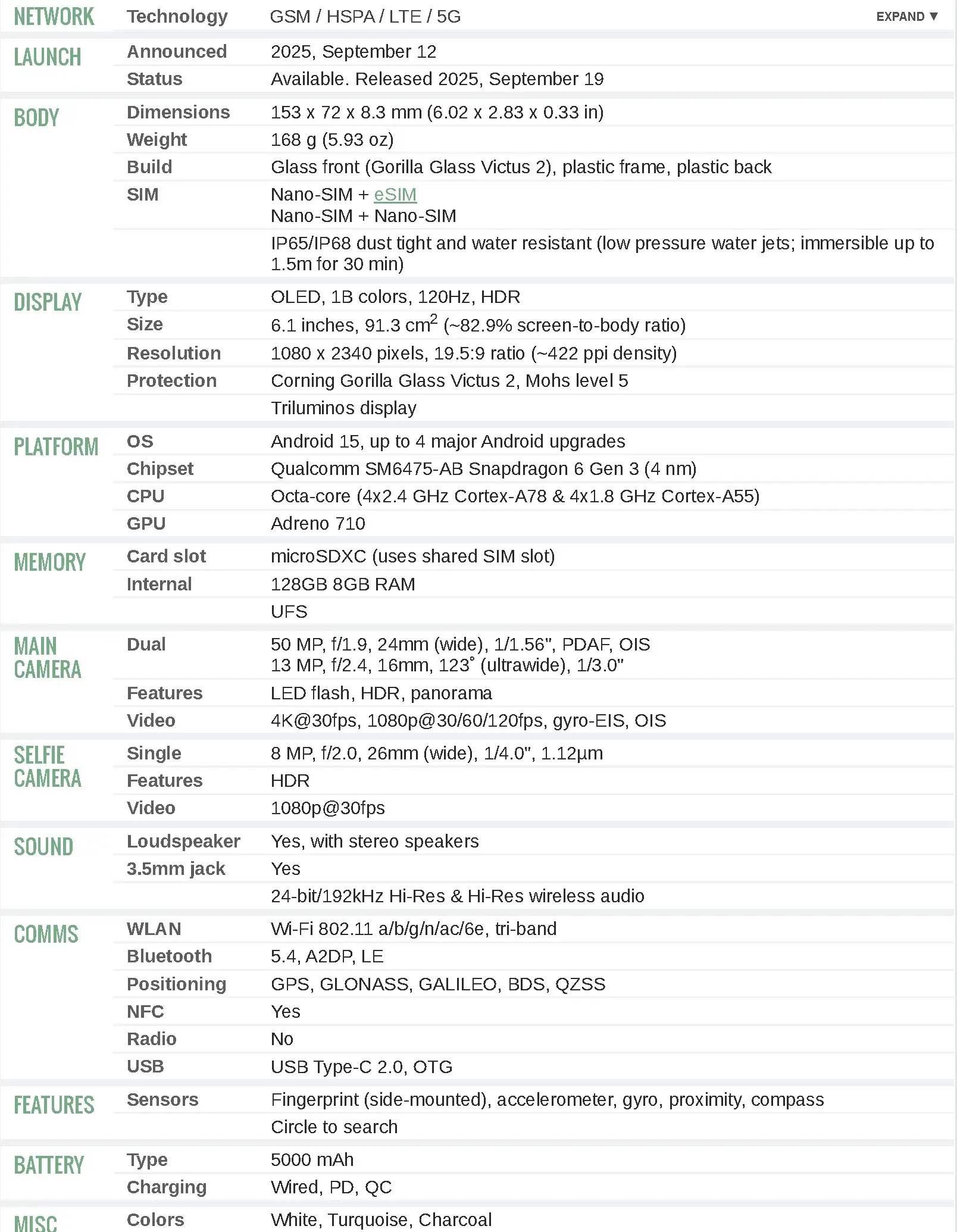 Runs Android 15 with minimal bloatware; 4 years of OS updates, 6 years of security patches promised