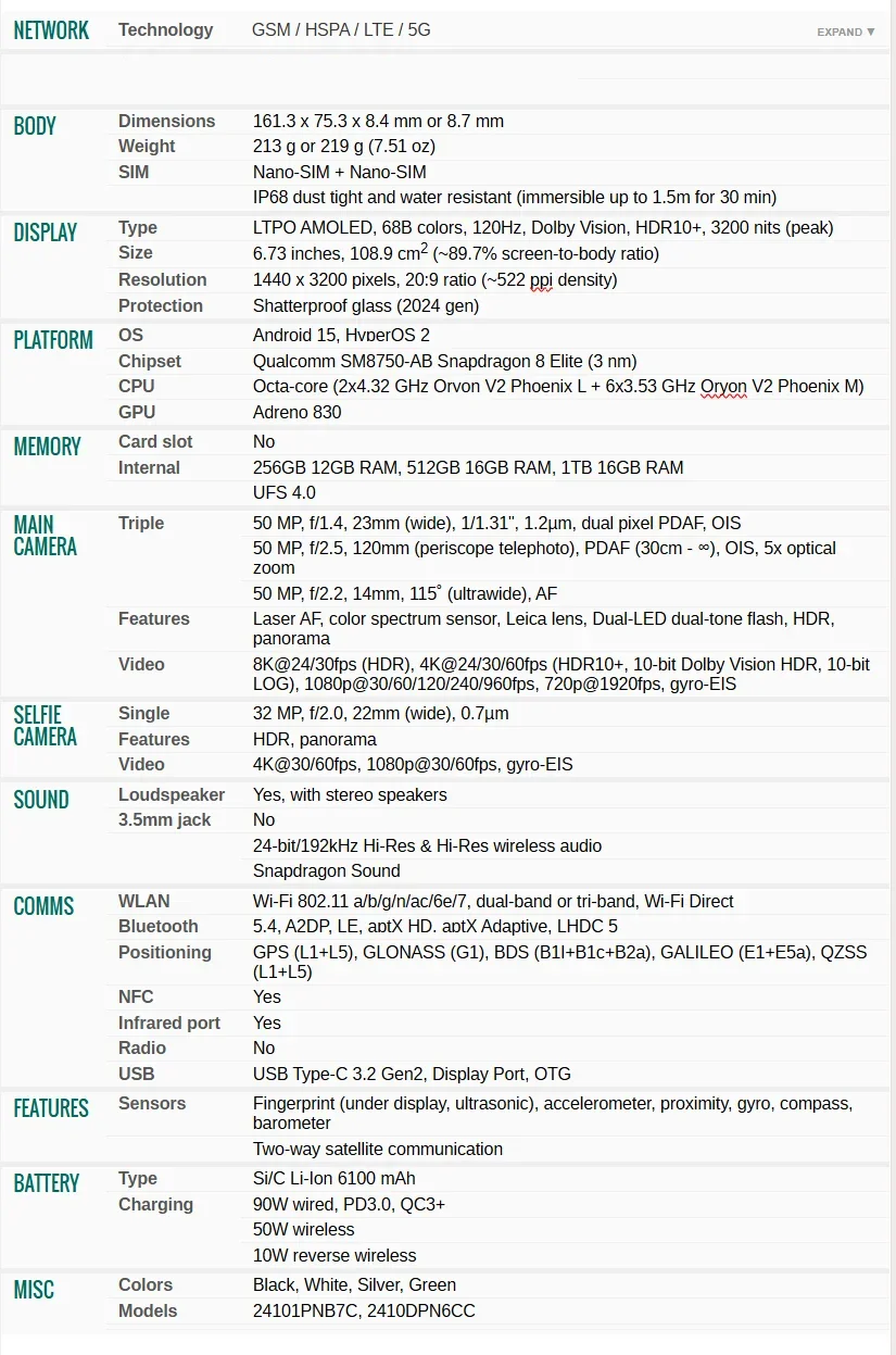 Xiaomi 15 Pro (Global Version) Specifications