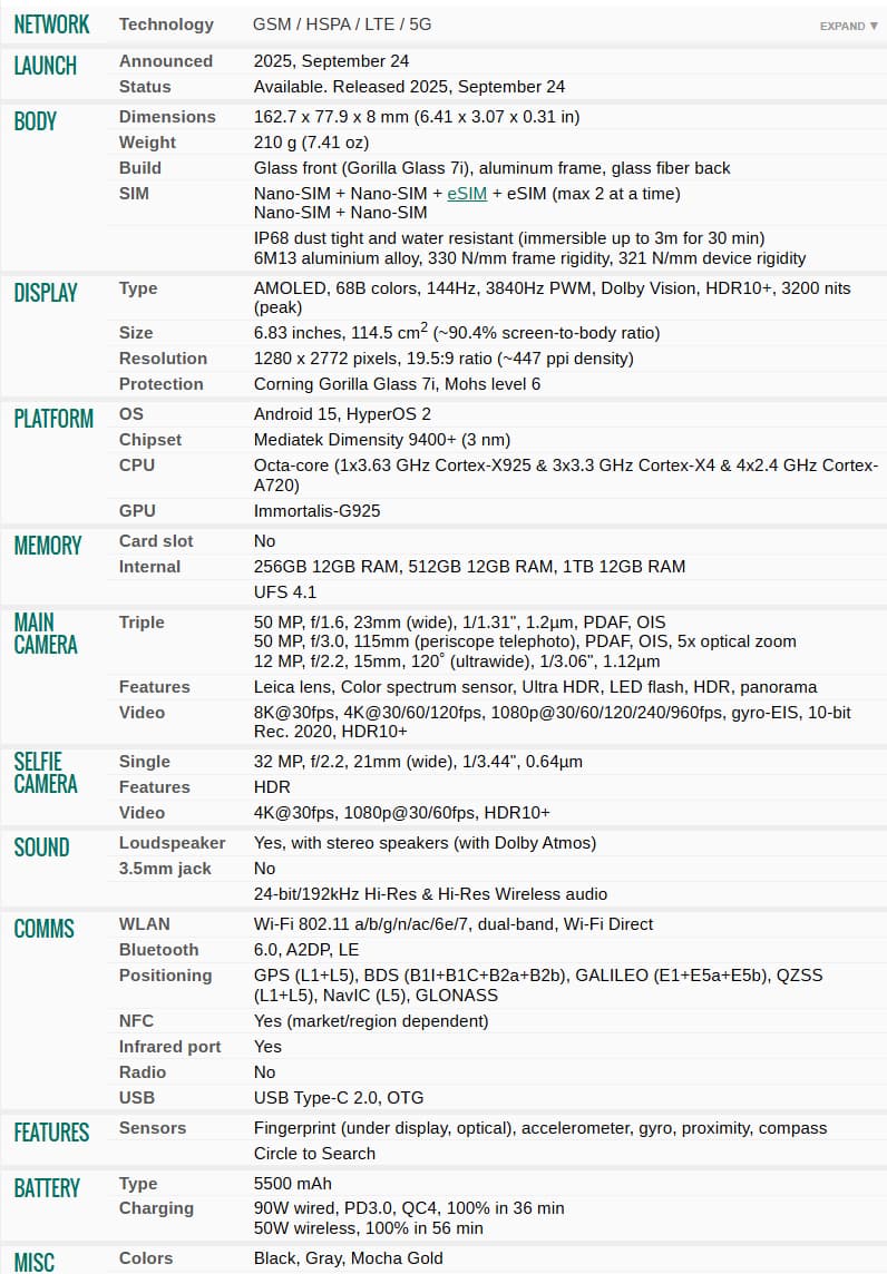 Features IR blaster, UFS 4.0 storage, no microSD slot; HyperOS 2 with AI-driven tools
