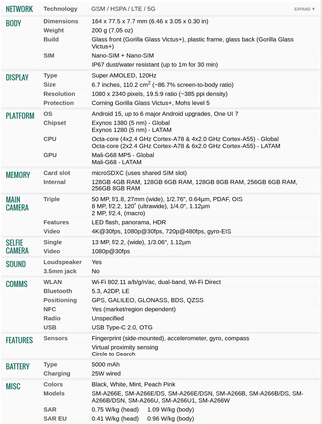 Exynos 1380 (5nm), octa-core CPU (4×2.4GHz Cortex-A78, 4×2.0GHz Cortex-A55), Mali-G68 MP5 GPU