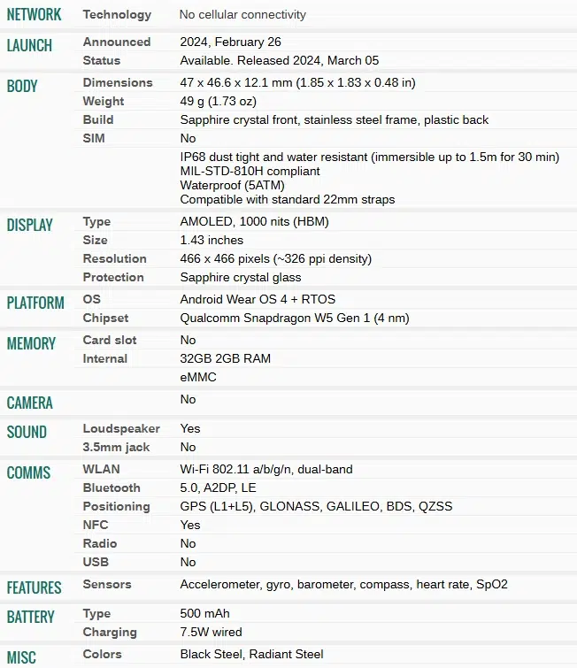 Powered by the Qualcomm Snapdragon W5 Gen 1 (4nm) and BES2700BP MCU, with 2GB RAM and 32GB storage (4GB eMMC for RTOS), the watch runs Wear OS 4 + RTOS, ensuring smooth performance on Android 8.0+ devices with GMS 23.45.23+ (iOS and Android Go not supported). It supports Bluetooth 5.0, dual-band Wi-Fi (802.11 a/b/g/n), and NFC for Google Wallet payments. Dual-frequency GPS (L1+L5, BeiDou, Galileo, GLONASS, QZSS) provides precise tracking. Controls include two physical buttons and a touchscreen, with Google Assistant integration. Features like Bluetooth calling, Google Maps, and over 100 watch faces enhance versatility, though some report limited third-party app compatibility.